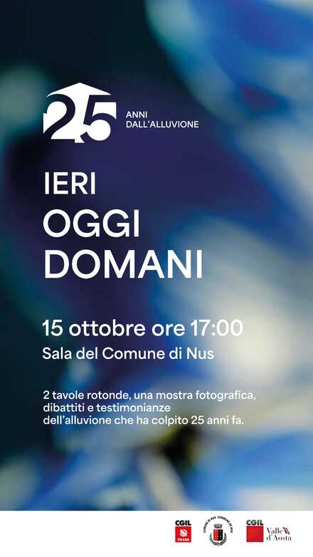 La Fillea CGIL Valle d’Aosta e il Comune di Nus organizzano l'evento "Ieri, Oggi, Domani" per commemorare il 25° anniversario della drammatica alluvione che ha colpito la Valle d'Aosta il 15 ottobre 2000.