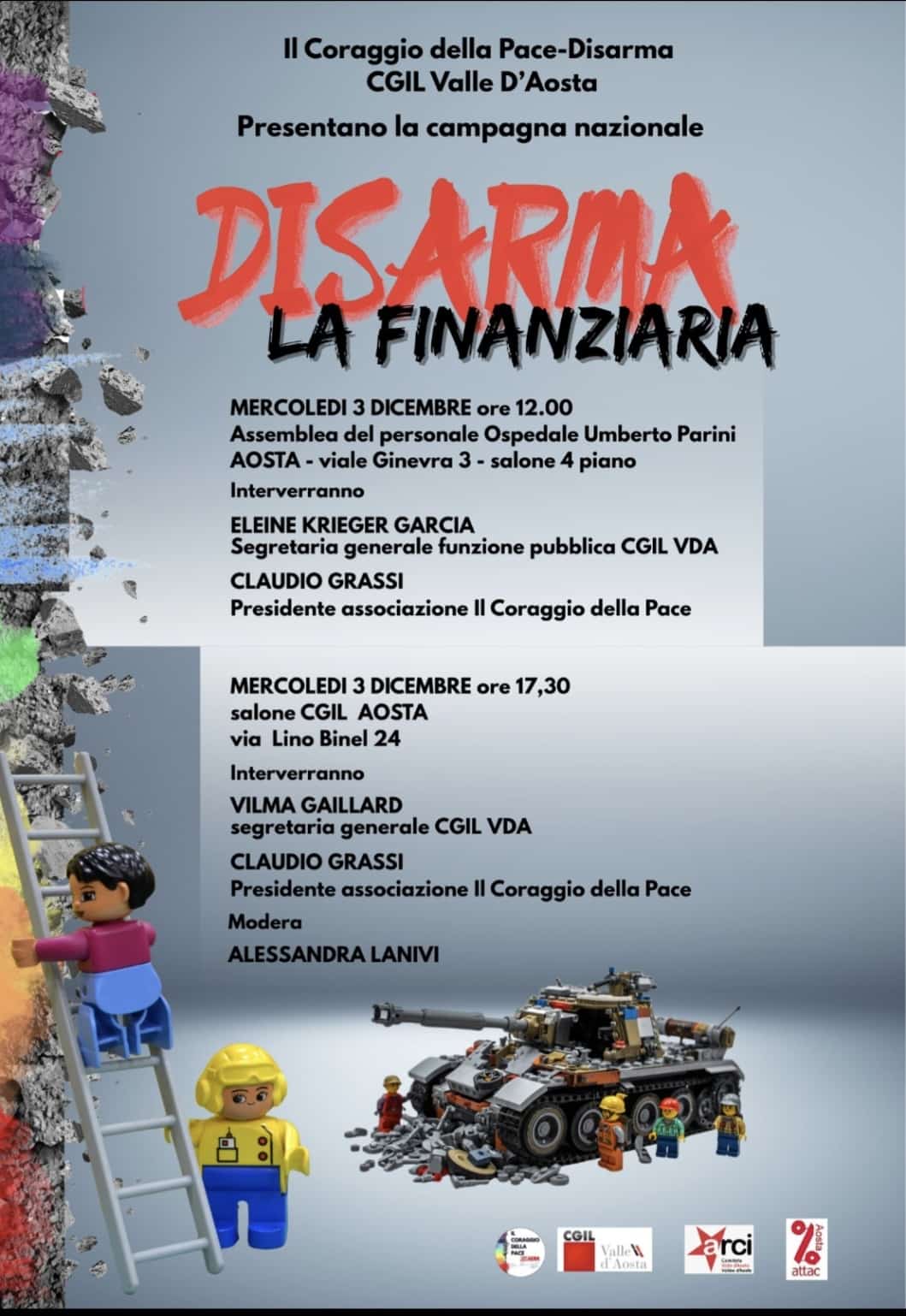 Fa tappa anche ad Aosta la campagna nazionale “Disarma la Finanziaria”, promossa dalla rete Il Coraggio della Pace – Disarma, per contestare la Legge di Bilancio varata dal governo Meloni. Secondo i promotori, la manovra rappresenta “una deriva di riarmo e austerità” che ignora i bisogni reali del paese e penalizza i settori più essenziali del welfare pubblico.